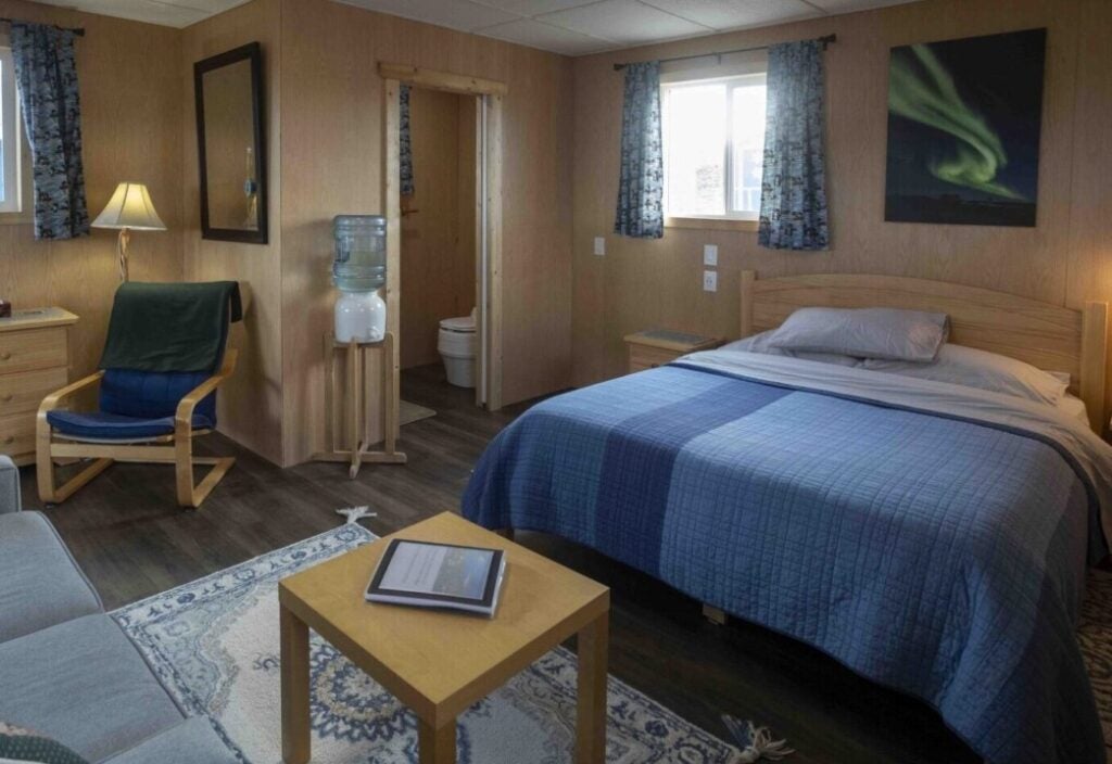 Aurora Cabin – Our deluxe guest cabin features a queen bed, couch, and reading chair. Amenities include a dresser, potable water stand, heater, and en-suite washroom. Enjoy a private dining area, coffee station, and incredible views of Point Lake.